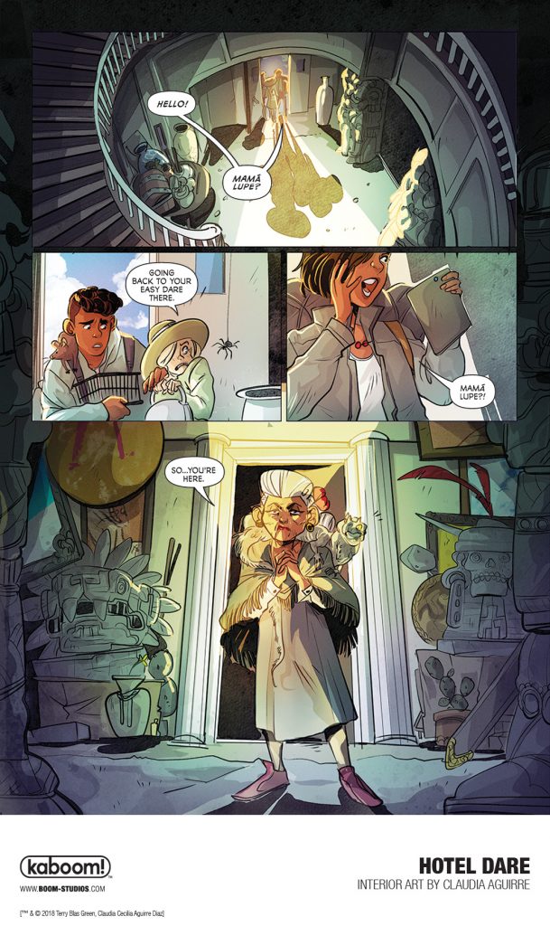 “What if you could open a door that would lead you to an all-new adventure that was so extraordinary that it surpassed the limits of imagination? For Olive, Darwin, and Charlotte, this is only the beginning of their summer with their abuela.” said Whitney Leopard, Editor, BOOM! Studios. “Terry and Claudia’s HOTEL DARE explores how we relate to new places, new cultures, and new families. This is an amazingly beautiful story filled with action, adventure, and the cutest and yet most terrifying creatures you’ve ever seen.”
