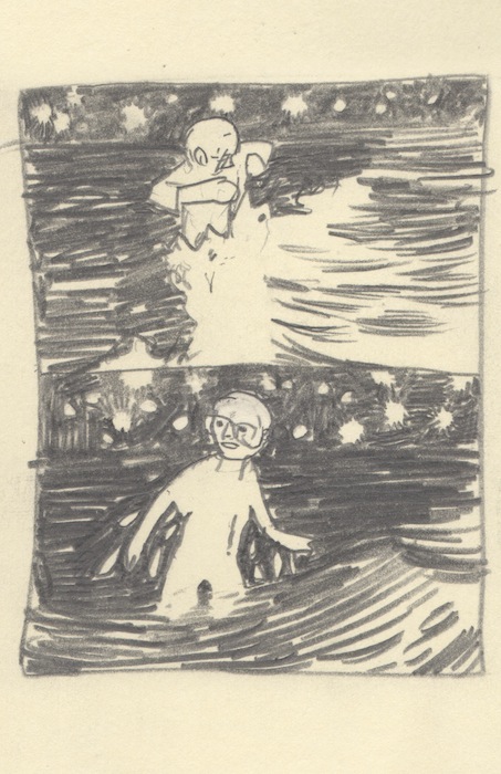 If you like that try Hawaii 1997. Like a lot of Alden’s work it’s autobiographical, but it’s also mostly a wordless storyboard about a magic moment on a nighttime beach: a miserable young boy meets a girl on the beach and they run around together. Yeah it’s a little Manic Pixie Dream Girl, but I think it transcends the cliche. If we’re lucky, we’ve all had one of these moments, when life becomes magical and full of possibilities…but the last panel reveals the price for such a moment. Alden draws it in pencil on yellow paper and still manages to captures the sparkling sky and water of the enchanted moment. It’s a technically very accomplished piece of work.