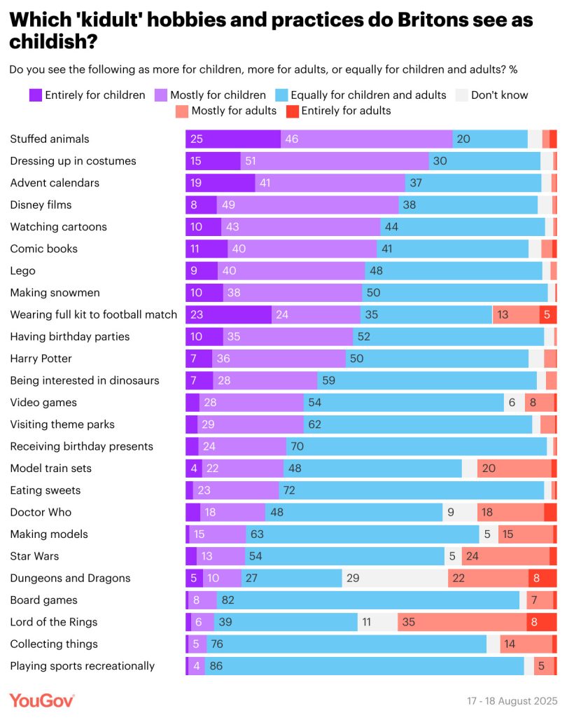 The survey asked a representative panel of 2,000 UK adults from across the political spectrum a series of randomised questions about their perspective on a selection of “kidult” activities as part of wider polling on general public attitudes. Kidult activities questioned included reading comic books, playing videogames, Dungeons & Dragons, Doctor Who, Star Wars, wearing costumes, birthday parties, and playing recreational sport (interestingly ‘recreational reading’ was not included).