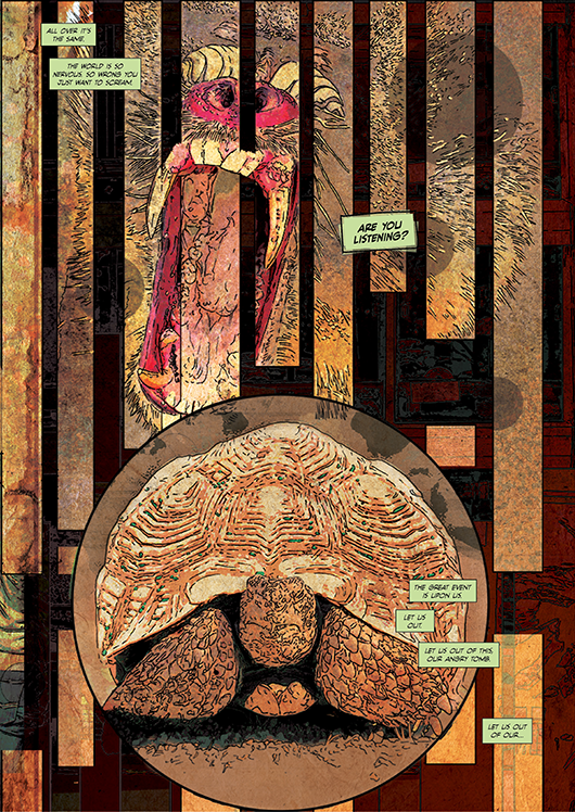 Written By Owen Michael Johnson, illustrated by John Pearson, lettered by Colin Bell and with design assists from Gavin James Weir, this book is one hell of a trip, visually stunning with art so original that it’s hard to compare it to anyone that’s come before — though when I tell people about this book I describe it as Moebius doing Animal Farm but with more radical politics and swearing — a story that is dense and esoteric and yet still manages to be gripping, visually stunning and haunting.