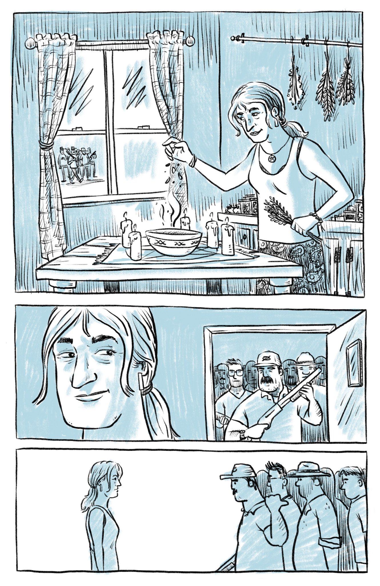 In Transfiguration, a short comic by Liz Leslie posted to Twitter, the lyrics of The Mountain Goats are used to tell the story of a trans woman who is subjected to a witch burning… but who ultimately turns the tables on the villagers who wronged her.