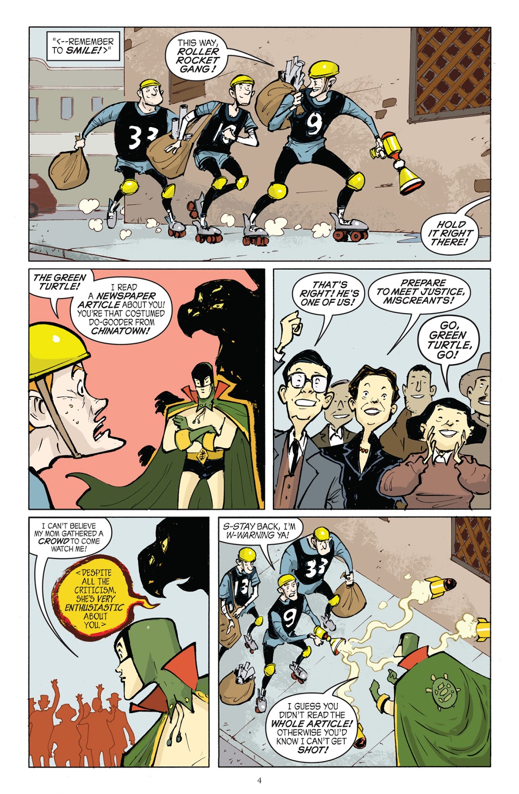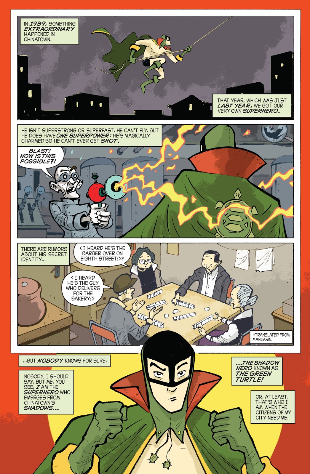 The comic, which is drawn by Sonny Liew, is based on the reimagining of obscure Golden Age comic superhero The Green Turtle, created by artist Chu Hing in 1944 for Blazing Comics. Yang and Liew believe The Green Turtle was the first Chinese American superhero, and the created an an entire origin story for him in The Shadow Hero. The giveaway comic is a new way to experience the character: