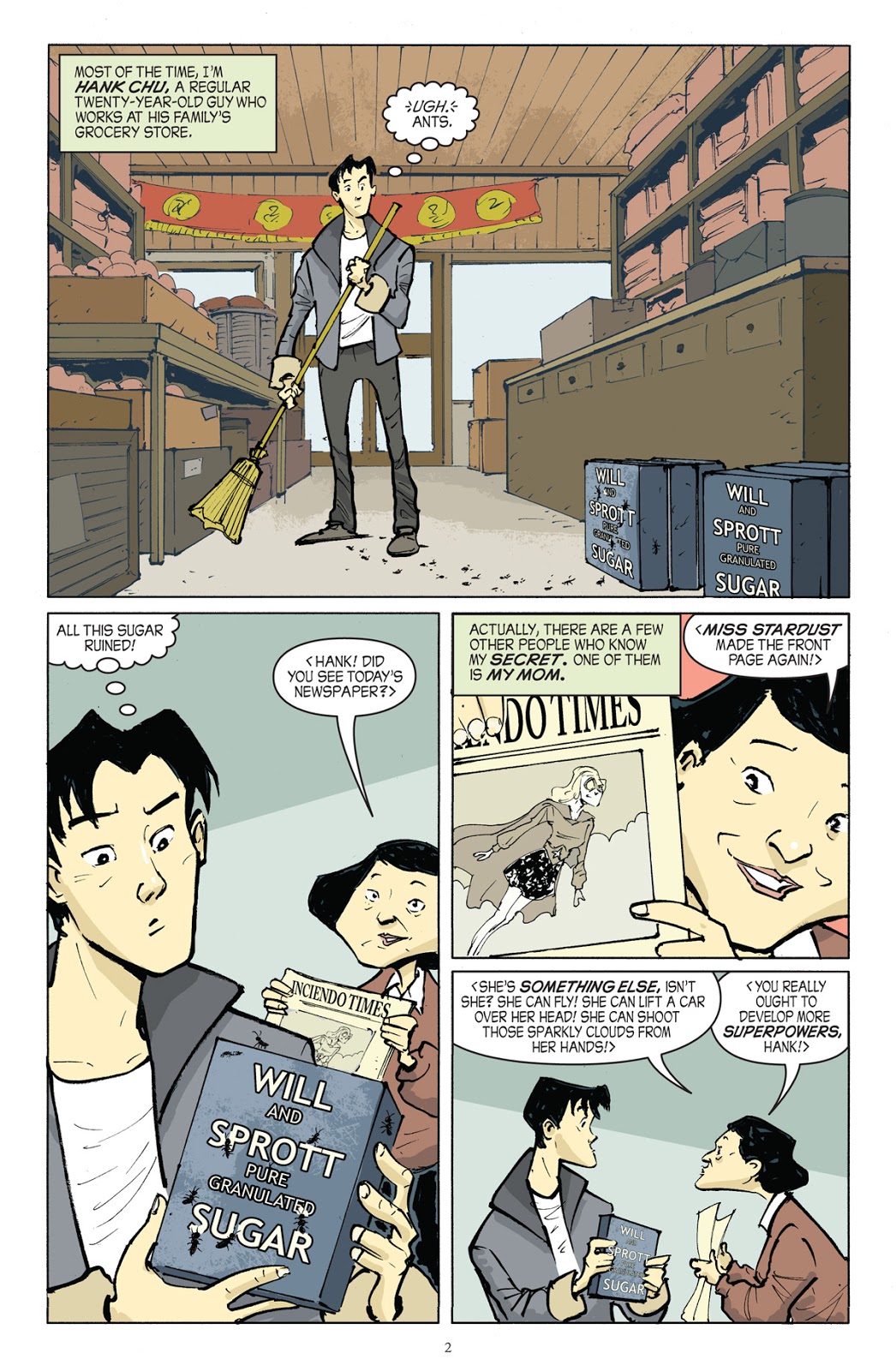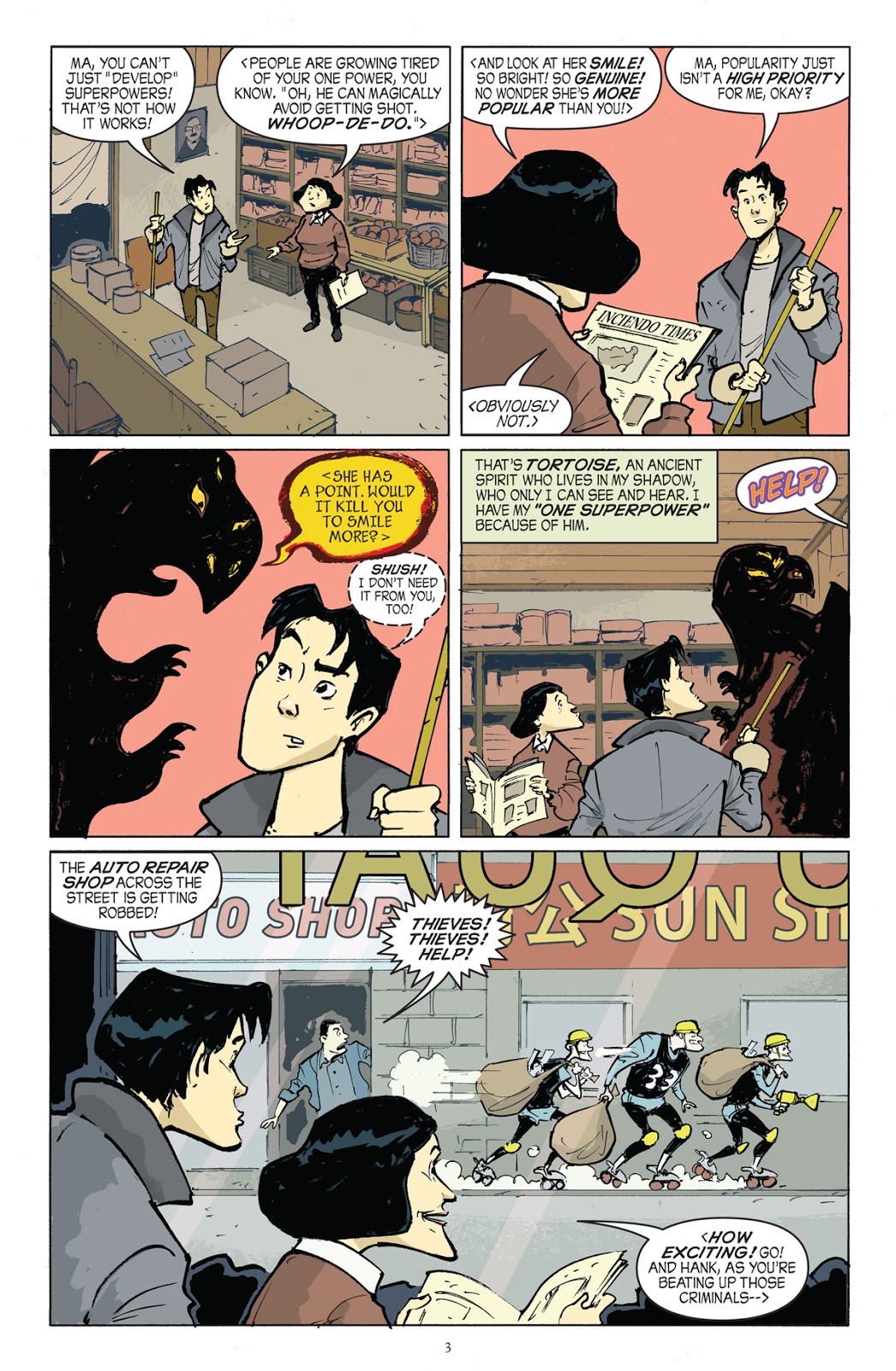 Most of the time, The Green Turtle is a regular 20-year-old Chinese American guy named Hank Chu, who helps out at his family’s grocery store. In Shadow Hero Comics #1, he partners with another costumed superhero known as Miss Stardust. While Hank doesn’t possess impressive powers, he never gives up and continues to save his city from villains — creating his own, original definition of what it means to be “a hero.”