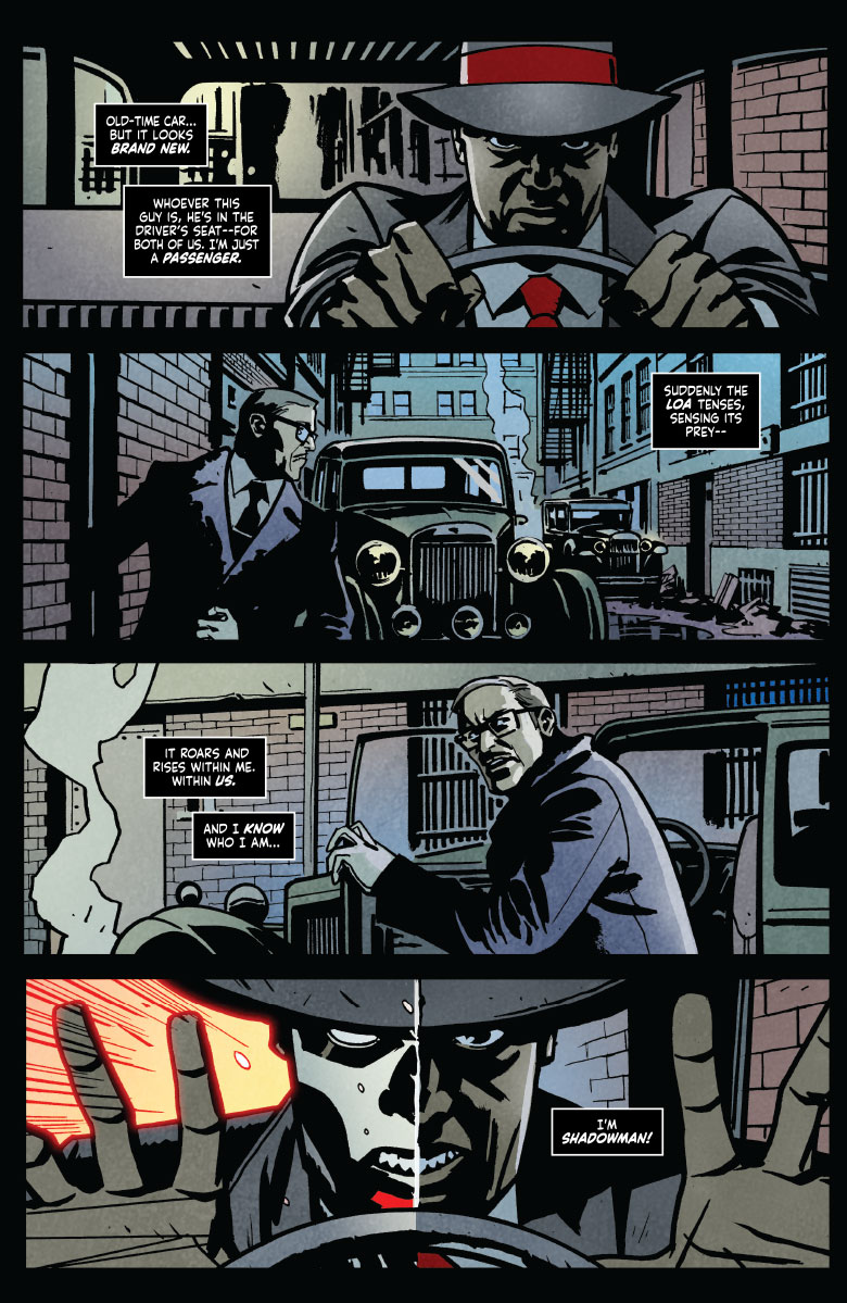 Shipping at the end of the month, Shadowman #4 has Jack Boniface falling backwards in time and visiting his ancestors who also bore the Shadowman loa… and perhaps not everything he’d been told about that loa was true. Jack’s first stop is riding the body of an ancestor in 1940 NYC for a little Nazi-hunting in the opening chapter of “Dead and Gone.”