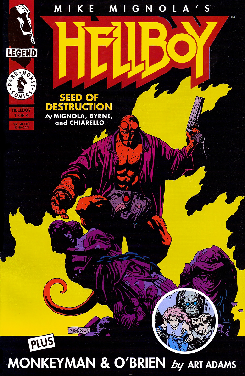 So in 1994 I picked up Hellboy: Seed of Destruction #1 for two reasons: my completist’s need for that little Legend logo in the top-left, and the much-friendlier-to-my-teenage-eyeballs Art Adams Monkeyman & O’Brien feature advertised in the lower-right.