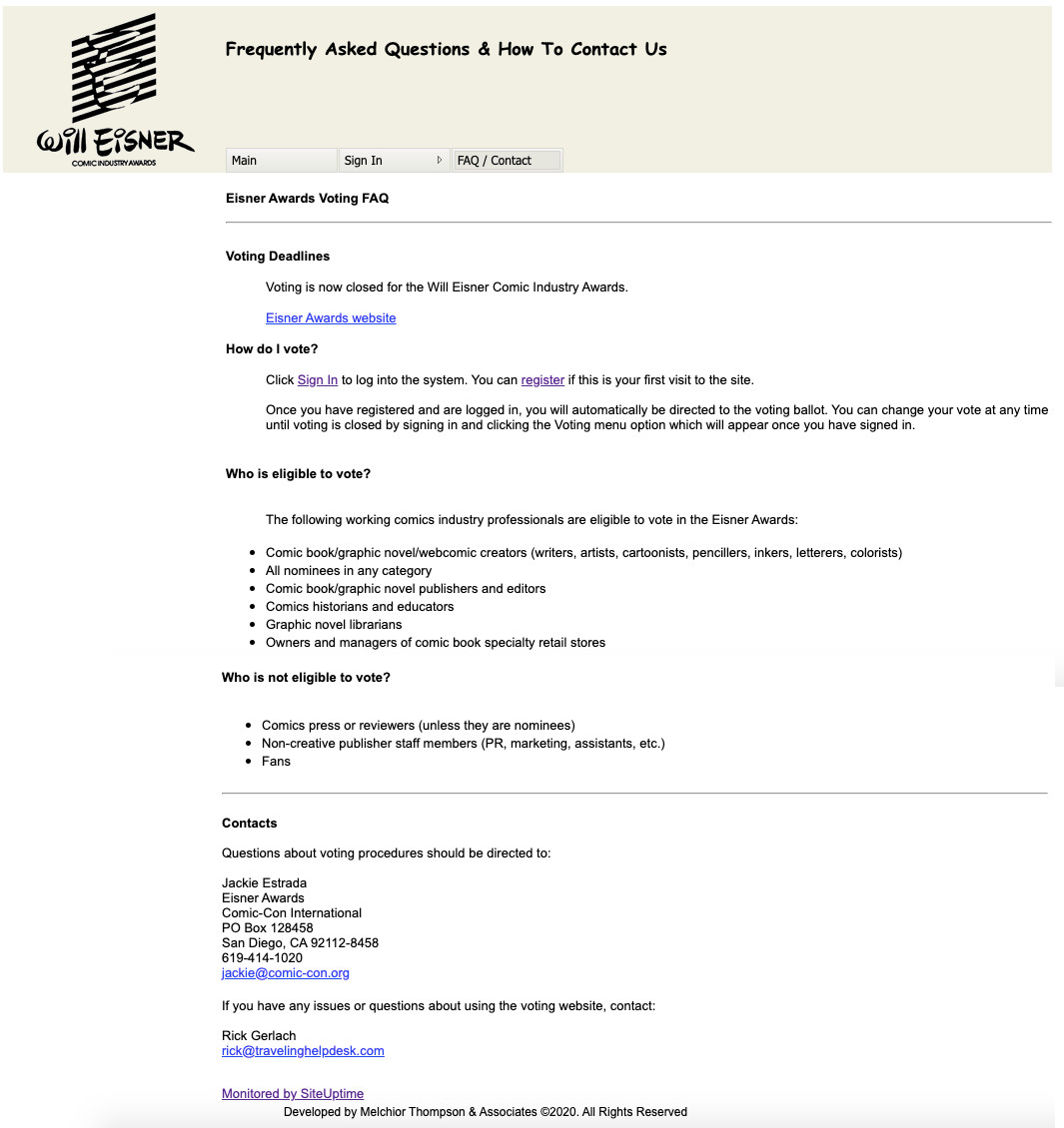 The FAQ page for the Eisner voting site.When voting reopened on June 24th, an announcement email was sent by Comic-Con administrator Jackie Estrada. The email, shared on Twitter by cartoonist Emil Ferris, read as follows: