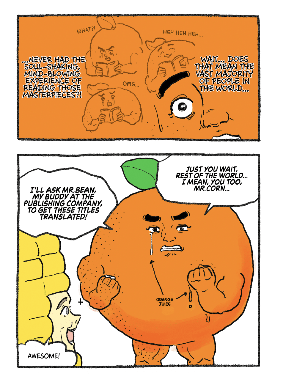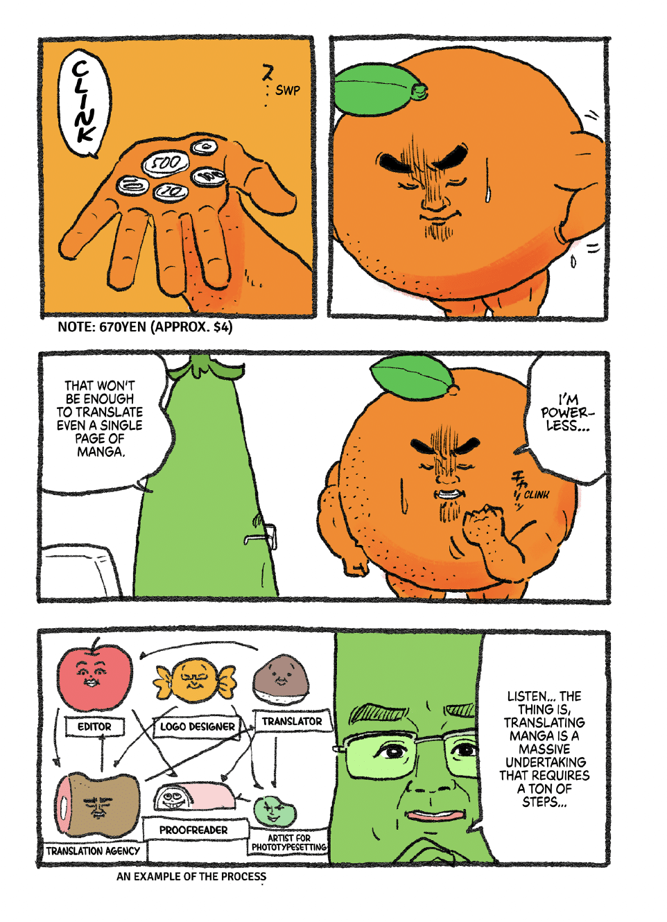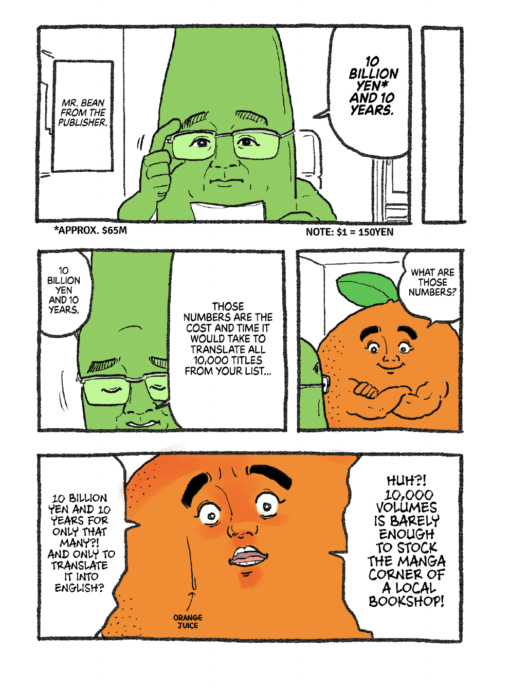 In the “Let’s Go Mr. Orange” manga, we meet Mr. Orange, a passionate manga fan, finding out from Mr. Bean that it would take “10 billion yen and 10 years” to publish 10,000 manga series in English. Mr. Bean continues, “Translating manga is a massive undertaking that requires a ton of steps,” involving editors, logo designers, translators, translation agencies, proofreaders and “artists for phototypesetting” (a.k.a. lettering)”