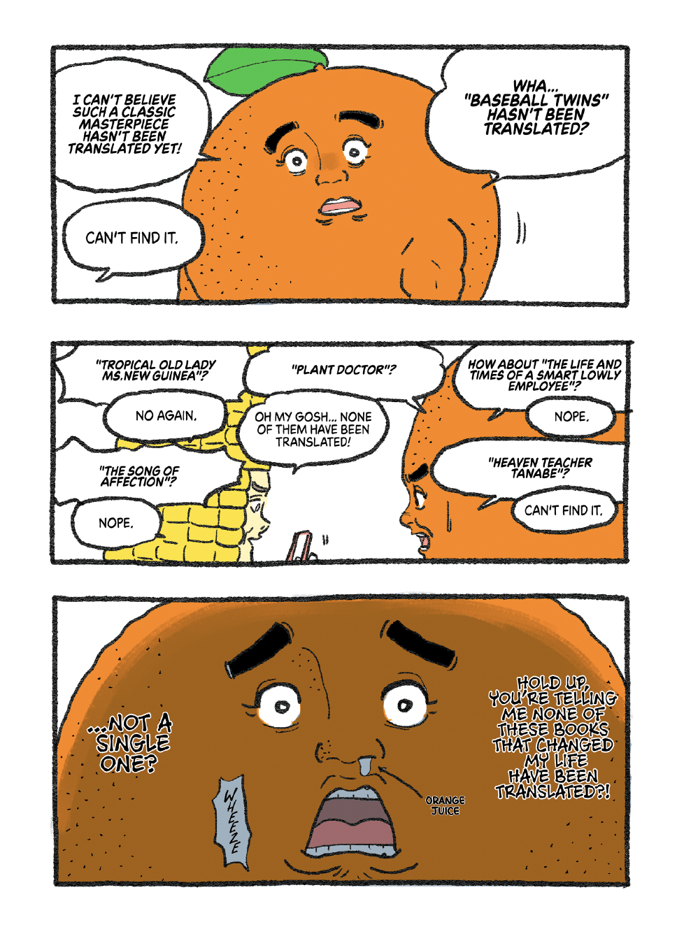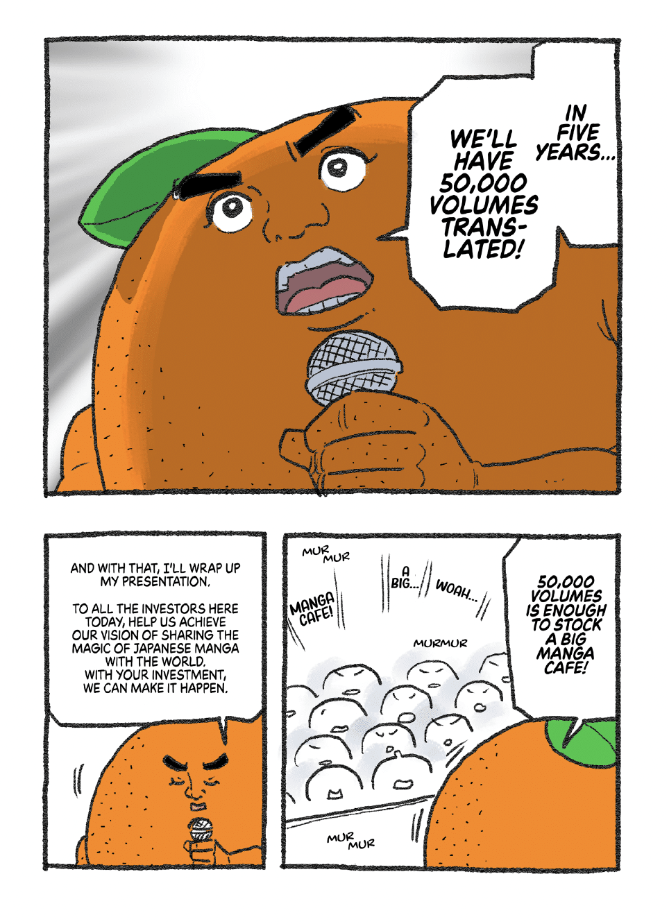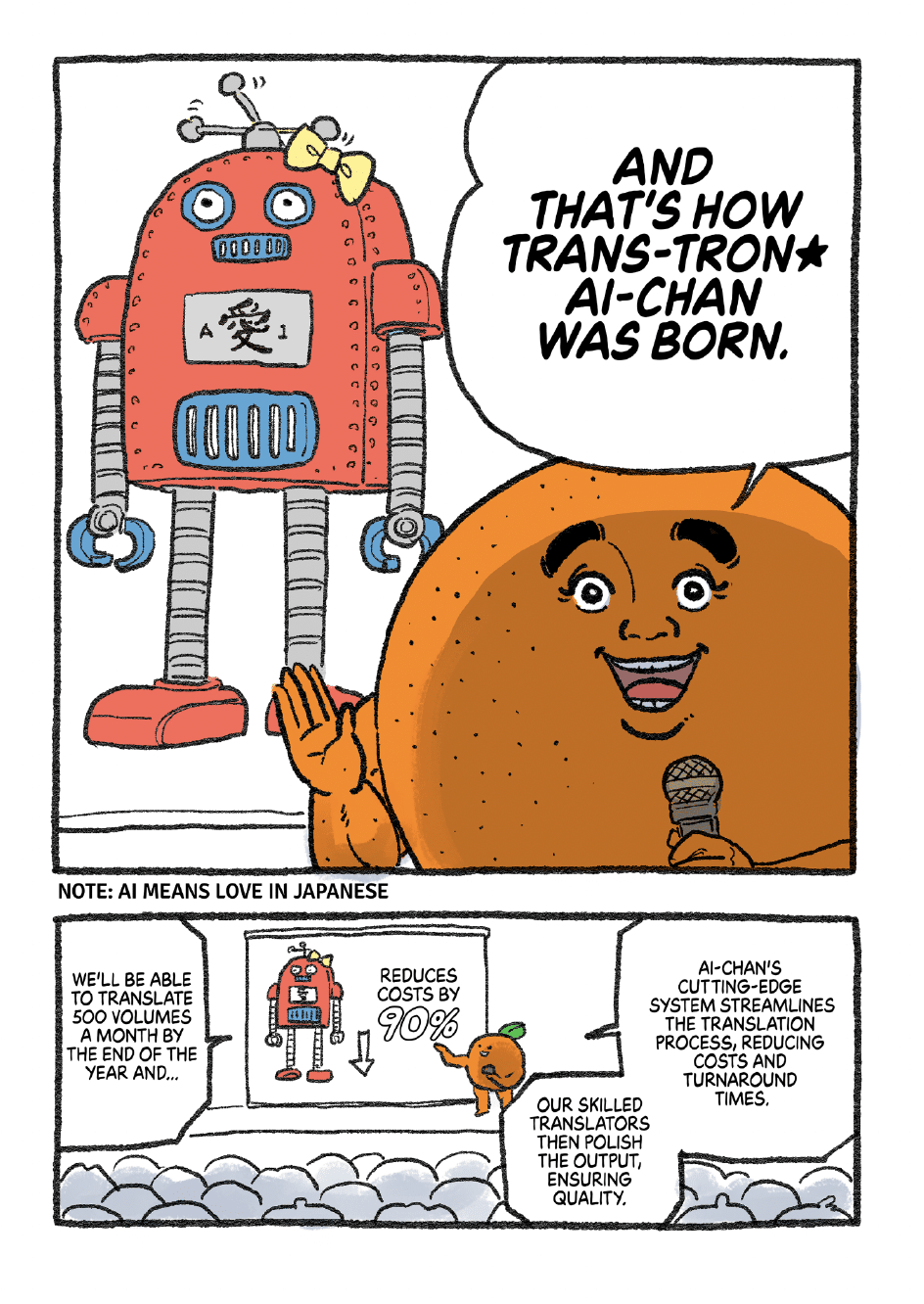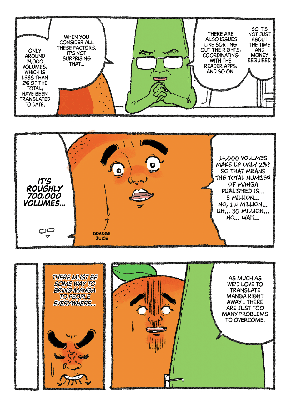 In the “Let’s Go Mr. Orange” manga, we meet Mr. Orange, a passionate manga fan, finding out from Mr. Bean that it would take “10 billion yen and 10 years” to publish 10,000 manga series in English. Mr. Bean continues, “Translating manga is a massive undertaking that requires a ton of steps,” involving editors, logo designers, translators, translation agencies, proofreaders and “artists for phototypesetting” (a.k.a. lettering)”