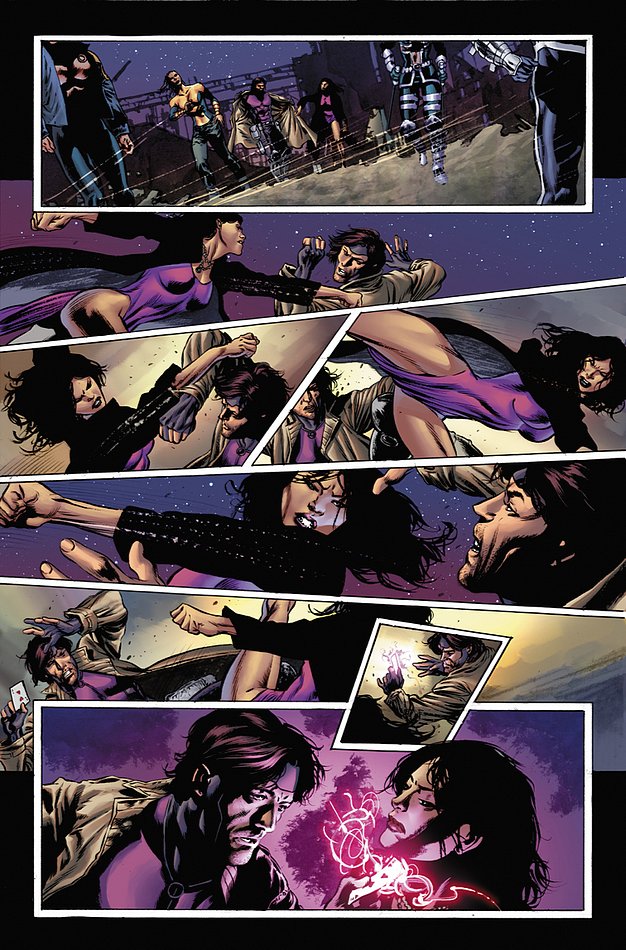 As spotted by Jarrod on the CBR forums (hi Jarrod!), a Mike Perkins fight sequence from next week’s Astonishing X-Men #55 clearly pays tribute to a previous fight sequence drawn years ago by Alan Davis for Uncanny X-Men. As you can see in the images below, Perkins has taken aspects of Davis’ original fight sequence and resequenced it to act as the storyboard for his version of the fight, in both cases an example of a gymnastic male taking a formal female fighting style. While Gambit takes the place of Nightcrawler, so Tyger Tiger replaces Sage. Here’s the page from Perkins, with the Davis pages following: