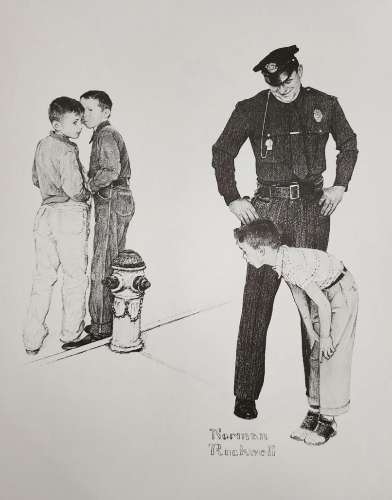 Penn’s Alice’s Restaurant features a performance by William Obanhein, the original arresting officer, as himself. Obanhein is an interesting figure in his own right, having been immortalized not only in “Alice’s Restaurant Massacree,” but also in a number of pieces of art by Stockbridge’s other famous artist-in-residence, Norman Rockwell. Obanhein most famously appeared in the black-and-white image “Policeman With Boys,” which you can see below.