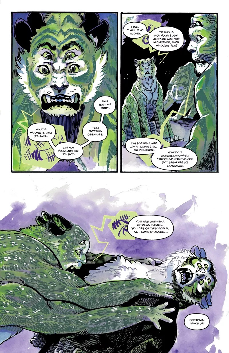 Del Duca explained that the world she and Seaton are building combines pre-colonial Central Africa with the dusty tech that Moebius (the pseudonym for artist Jean Giraud) played around with in his designs. It’s a mix of art and imagery that isn’t regularly seen in mainstream comic books.