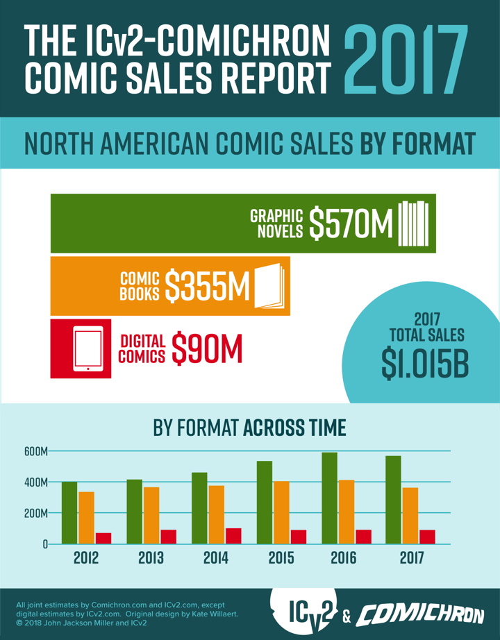 This is the fifth joint market size analysis from ICv2 and Comichron; the first four reports were for 2013, 2014, 2015, and 2016 sales. ICV2 and Comichron also previously collaborated on revised estimates for 2011 and 2012.