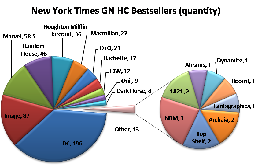 The New York Times samples both bookstores and comics shops, which is evident in the weekly lists. “Habibi”, published by Pantheon, was the number one title on the January 1 list. Kate Beaton’s “Hark! A Vagrant” took the top spot the next week, “Are You My Mother? was #1 four weeks, and many Hollywood blockbusters drove sales of Tintin, Batman, Walking Dead, John Carter, Avengers, and other titles.