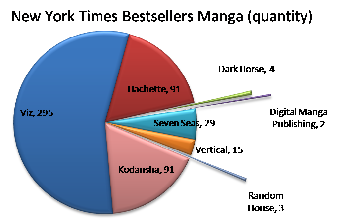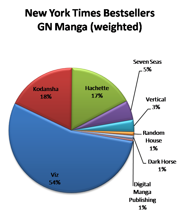 23 % of the bestselling titles are distributed by Random House (Del Rey, Kodansha, Vertical). Viz dominates the weekly Manga lists, monopolizing at least one week, if not grabbing the plurality most weeks.