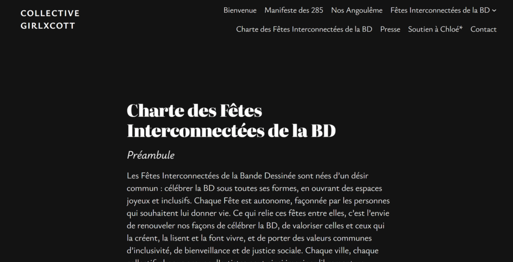 Translation (via DeepL) of the Charter for the Fêtes Interconnectées de la BD/Interconnected Comics Fairs, from the Girlxcott website