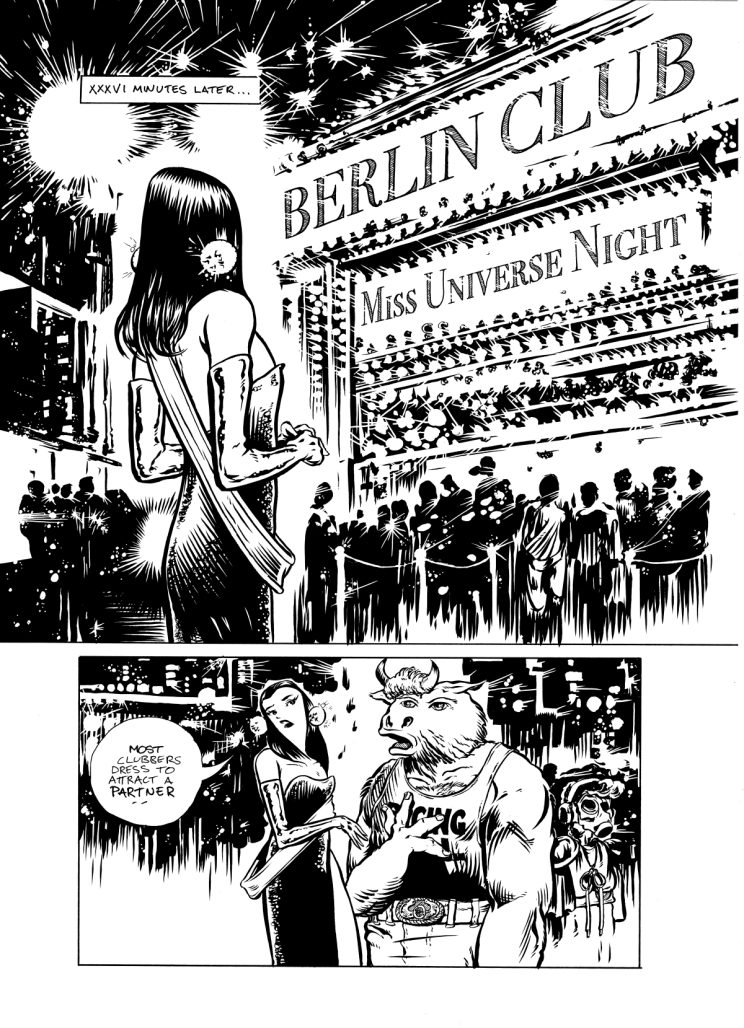 Greener Pastures #8 reworks a script originally intended for publication in 1997. The working title, “Sex & Violence,” has been changed to “Sweet Sweet Release,” which hints at a scintillating time for protagonist Trevor Bovis at The Berlin Club. The Beat can exclusively reveal Ashley Wood’s art for the comic, depicting the exterior of the local nightspot, below.