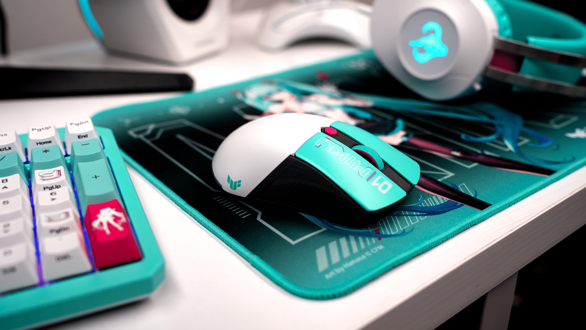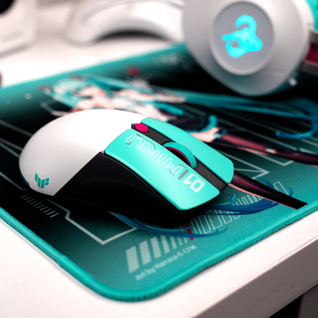 TUF Gaming Mini Wireless Mouse Hatsune Miku Edition – Weighing in at just 65g, this mouse features tri-mode connectivity, a 12,000 DPI sensor, up to 134 hours of battery life, and an adorable silhouetted Miku icon.