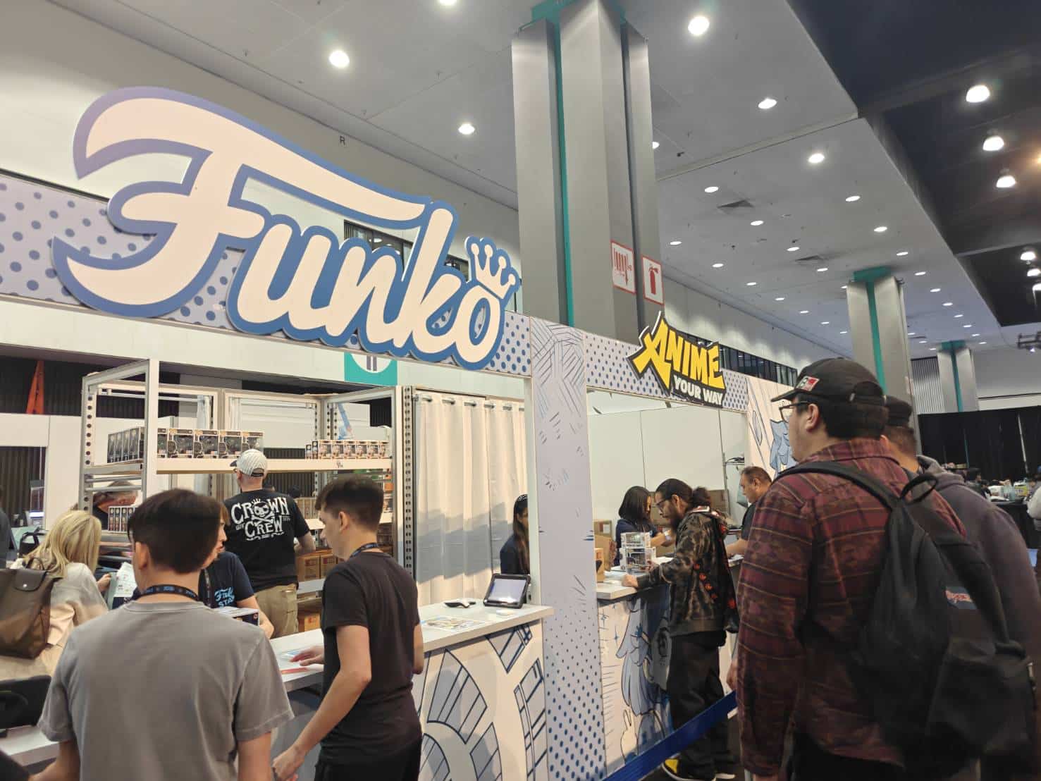A sign at the front of the booth highlights Funko exclusives available only at Anime Expo.