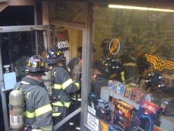 The fire occurred in the basement of the five-story building that houses St. Marks Comics, as well as a back and foot rub and acupuncture studio. A witness said the FDNY had to knock through the wall of St. Marks Comics to reach the fire’s source. There are no reported injuries. Let’s hope all the Silver Surfers and Wonder Womans are safe, too!