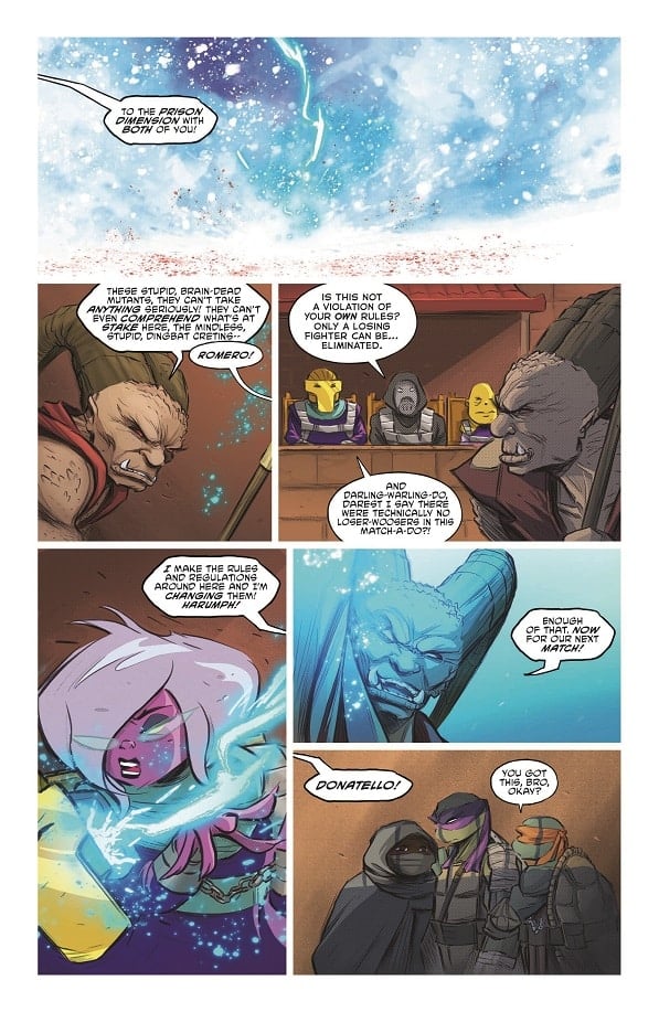 The current TMNT: Battle Nexus comic series event sees transdimensional villain and former Time Lord apprentice Savanti Romero has been gathering iterations of Turtles from various media and pitting them in combat against familiar foes and allies. With Lord Simultaneous captured alongside his fellow members of the Dimensional Council, a collection of ancient and ageless beings hailing from different dimensions, Savanti appears to have the upper hand. While the names of faces of most of the Dimensional Council have remained anonymous since they debuted in the 2014 Teenage Mutant Ninja Turtles Annual, the Battle Nexus series has been revealing the Council to be made up of characters connected to the Battle Nexus from other Turtles media such as the Daimyo from the 2003 animated series. With the release of issue #3 today, another member of the Council is unmasked as Big Mama in her human form.