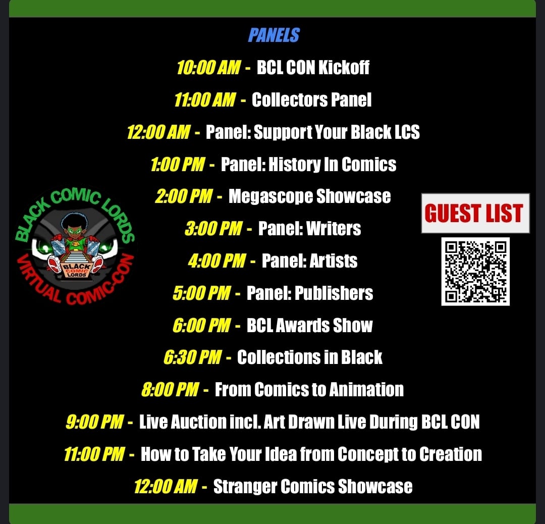 About the BLACK COMIC LORDS: The Black Comic Lords (BCL) is a multi-platform Black Comics Community Hub that celebrates Black comic book characters, books, creators, publishers, collectors and fans. BCL started as a Facebook Group in 2021 and has grown to include a prolific YouTube podcast library, a website database of noteworthy Black comics and multiple social media platforms. BCL’s goal is to establish a nexus for the Black Comics community for interaction, education and support. The Virtual Comic-Con is the first step in a progression to BCL having its own live Con in the future. Buy the comics. Read the Comics. Black Comic Lords. We gotchu.