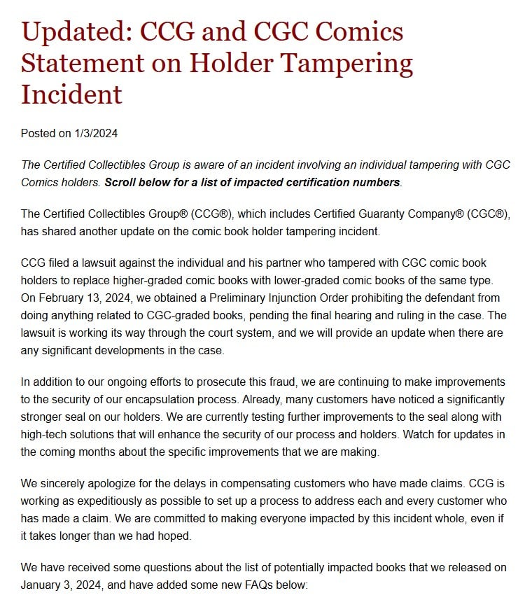 This, later dubbed “Swapgate” led CGC to change their “encapsulation process,” with CGC putting out a statement in January of 2024 that read: