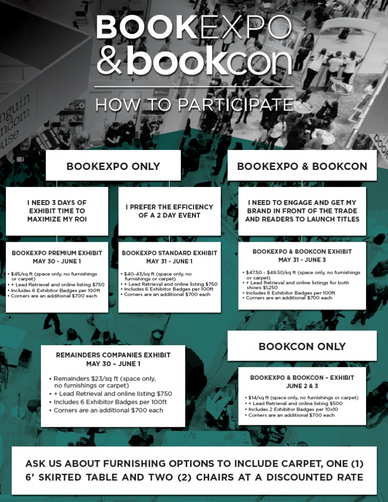 There’s a new wrinkle: Part of the trade show floor will be open on Wednesday, allowing exhibitors in the B2B “BookExpo only” Hall 3-A to exhibit for three days, instead of the usual two. Normally, only the Remainder Pavilion was open that day. In addition, there is general programming offered as well, in addition to the usual professional development workshops. Of special note: Wednesday morning, 9:30AM, Barnes & Noble Chairman Len Riggio will give the grand opening keynote address.
