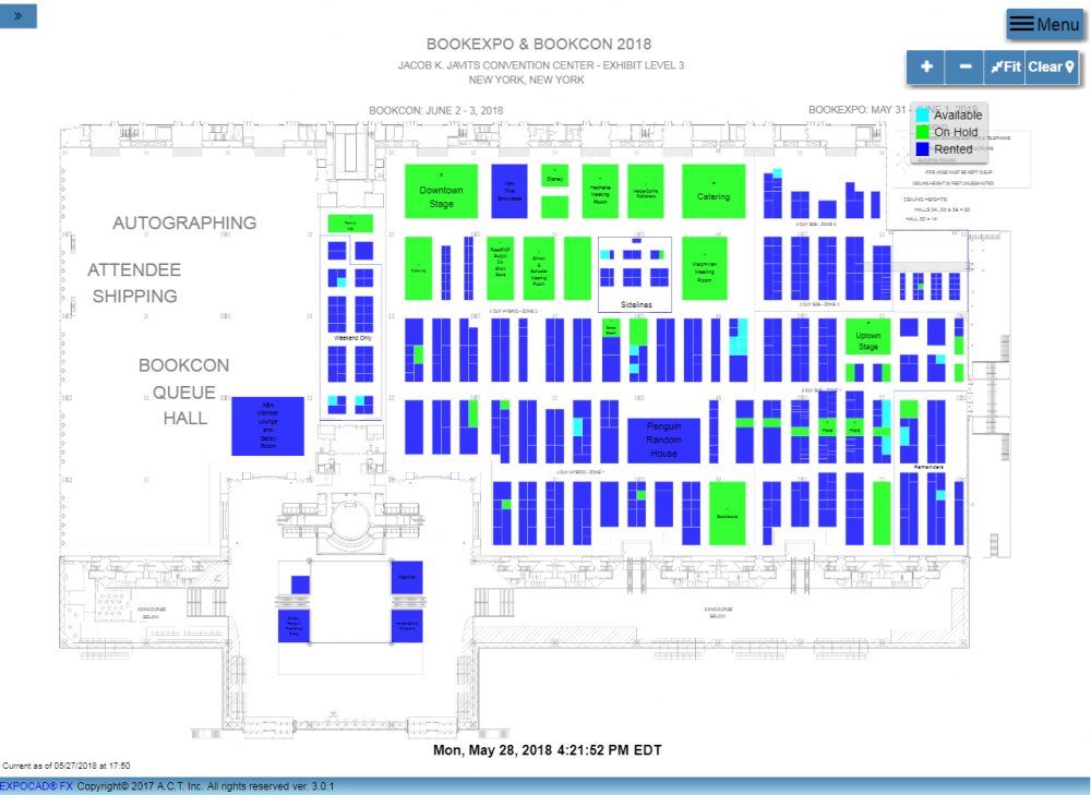 The back two tiers of booths in Hall 3-B are mostly meeting rooms and event spaces. Will the publisher meeting rooms be converted for fans during the weekend, or just be empty boxes, creating a dead zone similar to Ingram’s “ghost town” of last year? (If they were only for BookExpo, they could be placed in 3-E, and dismantled overnight.) All of the publisher big enough to afford meeting rooms will have numerous books to promote, and those meeting rooms could be used for signings, reducing congestion in the main booths. (I think this is very likely, as Penguin Random House does not have a meeting room at the back, but does have a large piece of carpet for crowd control, just like they did last year. (There are meeting rooms in 3-A, so it looks like the back of 3-B is event space for Book Expo.)