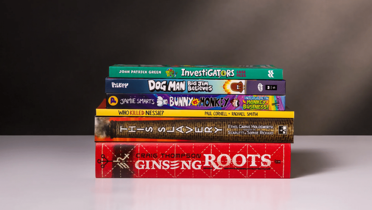 The six nominees in line for the British Book Awards’ inaugural Graphic Novel of the Year are a mix of kids titles and pieces for adults – all of which are published in the UK. Half are UK editions of work by American creators: Dog Man: Big Jim Believes, by Dav Pilkey (Scholastic UK), Ginseng Roots, by Craig Thompson (Faber), and InvestiGators: Case Files, by John Patrick Green with Steve Behling and Chris Fenoglio (Macmillan Children’s Books).