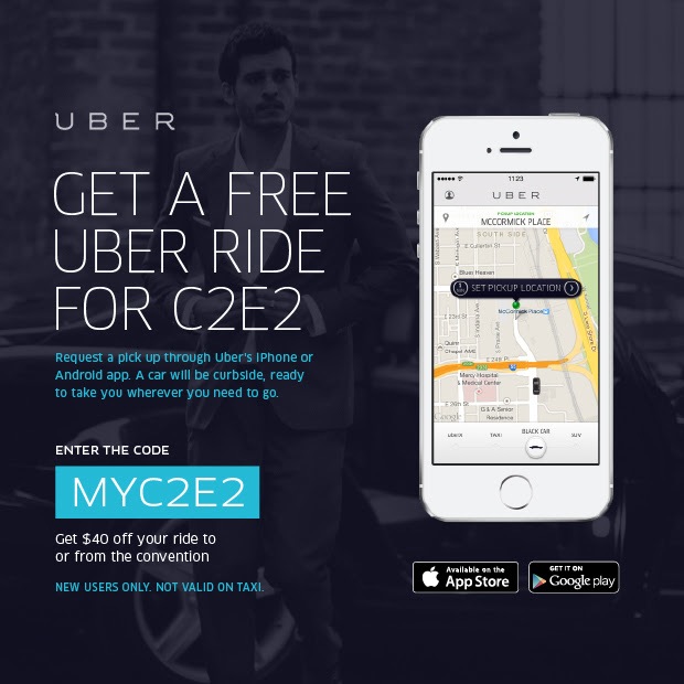 As attested by Torsten’s comprehensive transit guide, getting around the cavernous McCormick Place where the ongoing C2E2 show is being held is no easy matter and getting away from it can be hellish. However, the show has teamed with Uber, the get a ride app, to offer a FREE ride for new signees. Existing users can enter to win $100 in Uber credit.