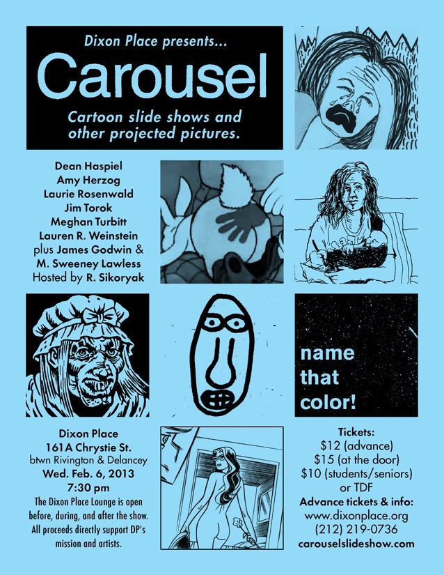 About four times a year, noted cartoonist Robert Sikoryak (Masterpiece Comics) hosts Carousel: Cartoon Slide Shows and Other Projected Pictures. This is an event where artists and writers present their comics though a slide show while vocalizing the dialogue and narrative, sometimes incorporating music and sound design. For those in attendance, the resulting experience comes closer to watching a play than a movie or an animation. Sikoryak describes it as “a cross-pollination of theater and comics.”