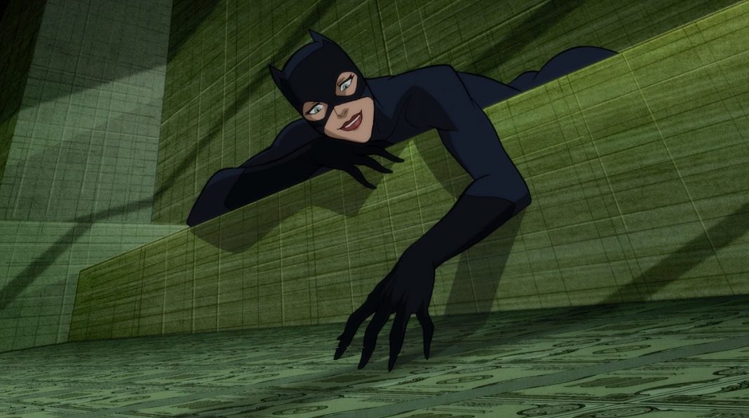 Catwoman leads Batman to a huge stash of Falcone money in a turning point scene from Batman: The Long Halloween, Part One. Catwoman is voiced by the late Naya Rivera (Glee).