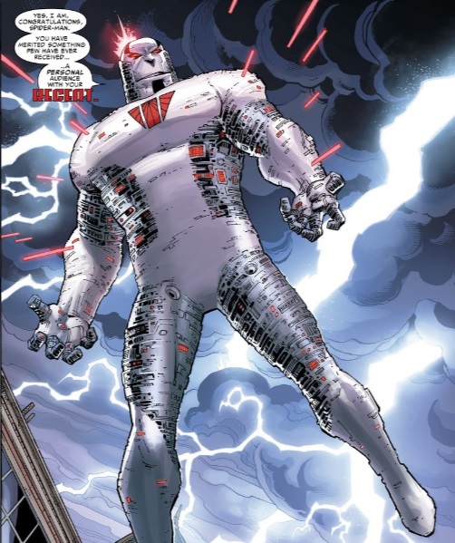 Those who’ve read Dan Slott‘s epic Spidey comics run will recall that Cellar prison conceived by the character Augustus Roman better known as the Regent. Debuting in the Amazing Spider-Man: Renew Your Vows miniseries by Slott and artist Adam Kubert, Regent used the Cellar prison as a front to siphon the powers from incarcerated supervillains. If you look closely and you’ll notice a character and you’ll see Regent, or at least a character wearing his trademark insignia.