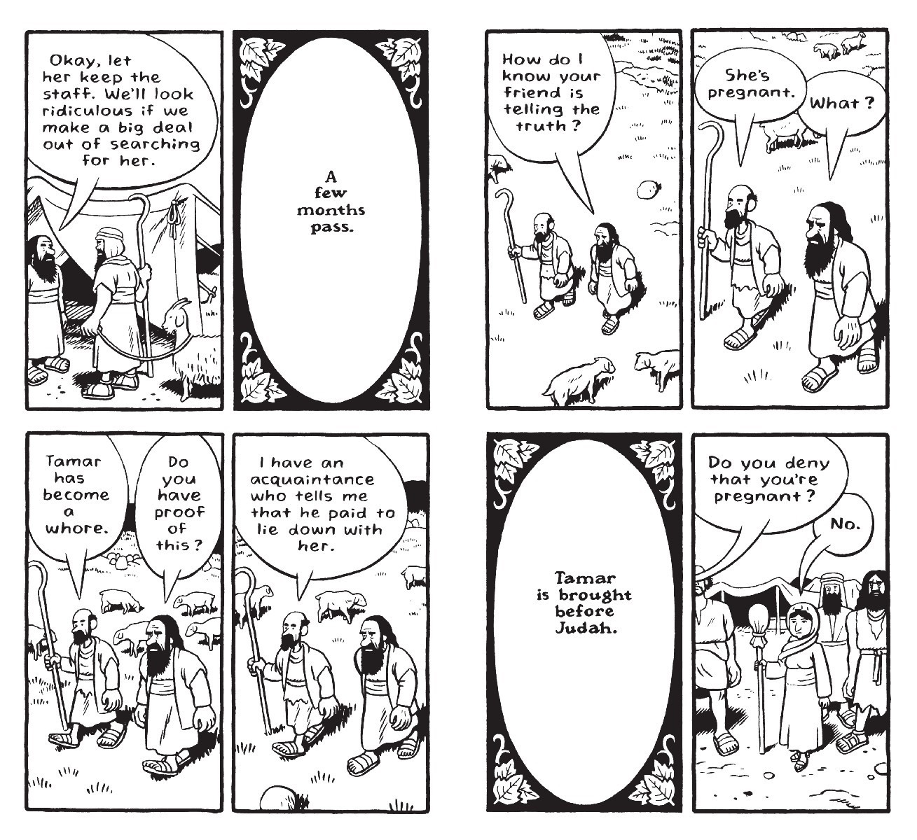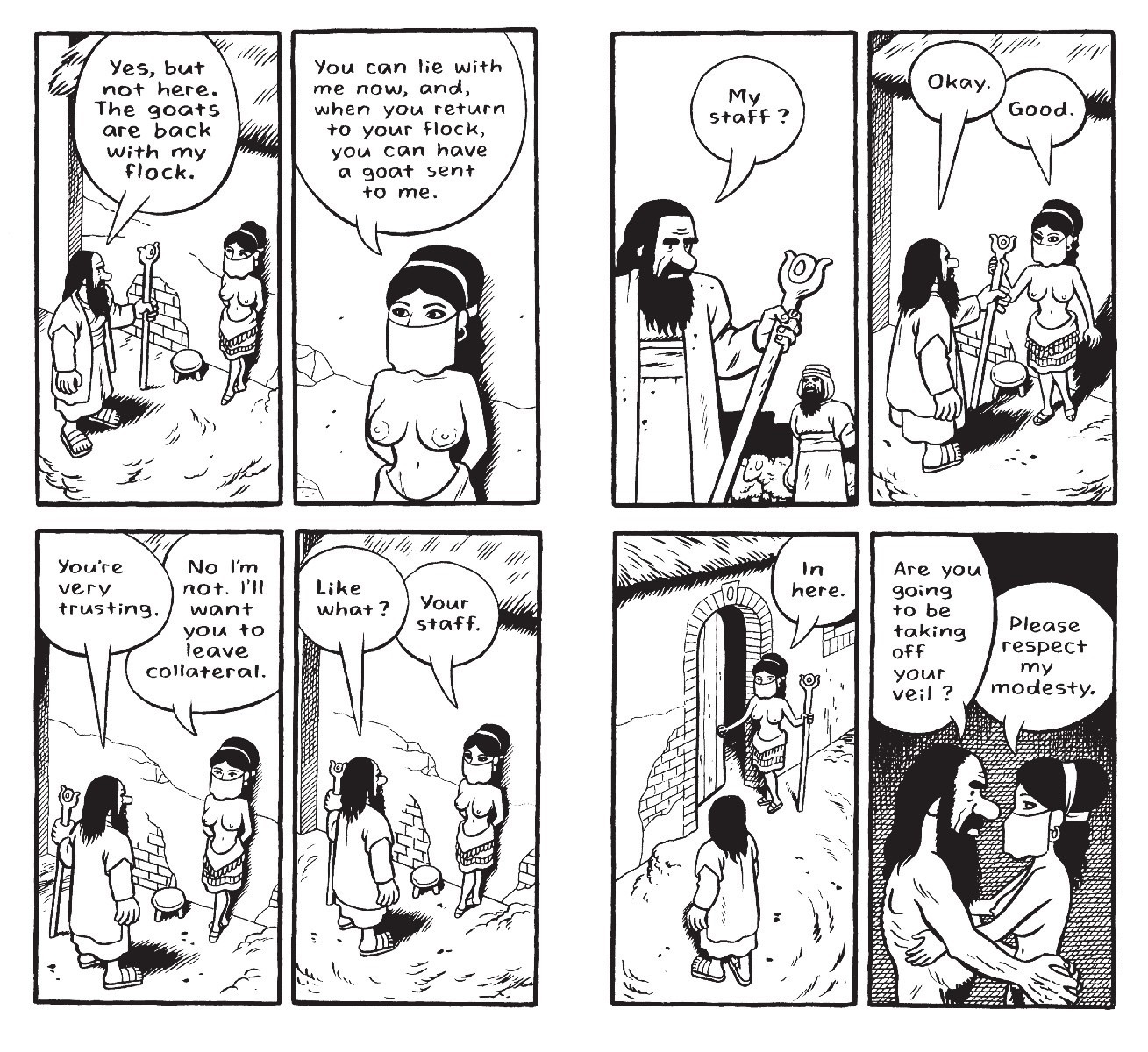 Of course, because it’s Chester Brown, Mary Wept is as weird a comic book as you will ever find. The cartooning is awesome, totally deadpan in its depiction of a naked God, naked men and women, sex acts, violence, ritual prostitution and much more. The stories of Tamar, Rahab, Bathsheba and Ruth from the Old Testament are full of drama and emotion, but you’d never know it from Brown’s emotionless characters, The women seem to be toughing it out in a brutal society, playing the odds to get some respect or property in a social system that’s rigged against them. The men are all motived purely by their brain stems, it seems.