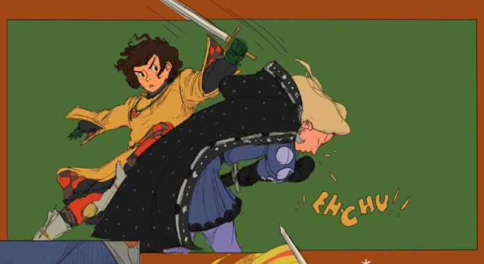 The Chromatic Fantasy promises to be “steamy, funny, and full of adventure.” And the artistic style, reminiscent of stained glass and illuminated manuscripts, will be complemented by the 312-page softcover’s golden gilded page edges. Scroll down to the bottom of the article to take a look at The Chromatic Fantasy today, in advance of the graphic novel’s publication on October 18th, 2023.