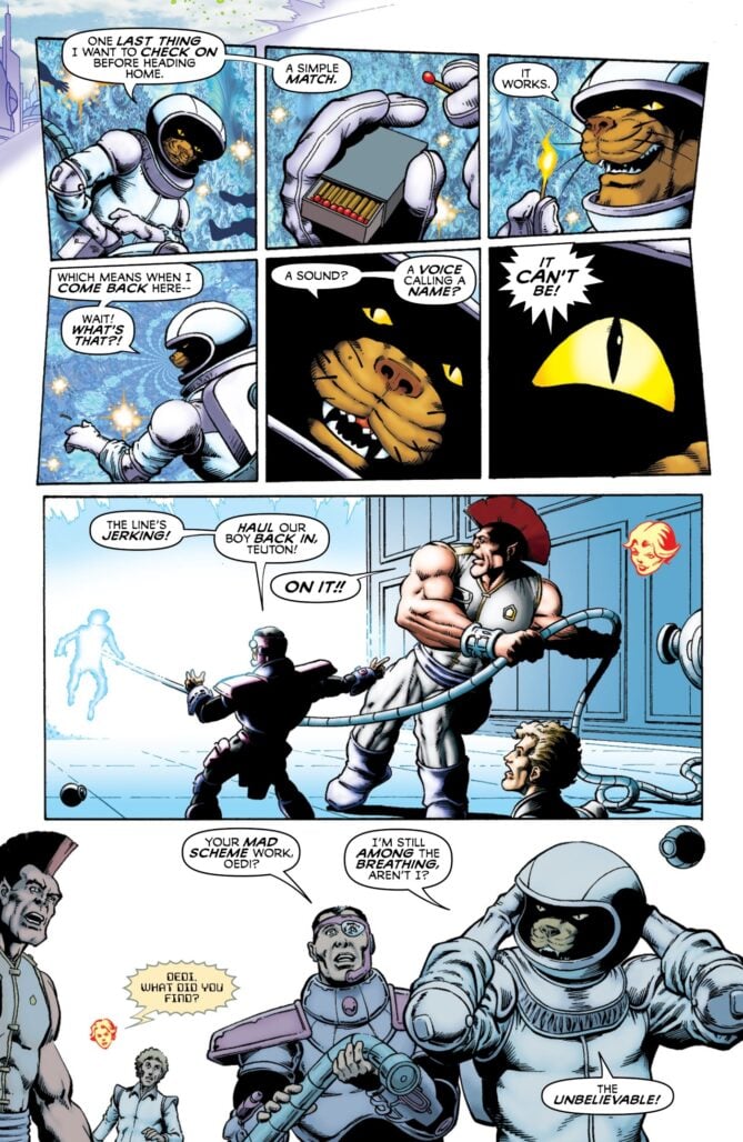 Dreadstar Returns by Starlin, Jaime Jameson, and Dave Lanphear picks up 25 years later as if nothing much has happened in between. It briefly reintroduced the major characters (after a dramatis personae as well) and then dives right in to a mysterious energy bubble threatening to first engulf the planet that serves as Dreadstar’s base of operations, then the universe, that’s oddly calling the name of the woman at the head of the organization that rules the galaxy.