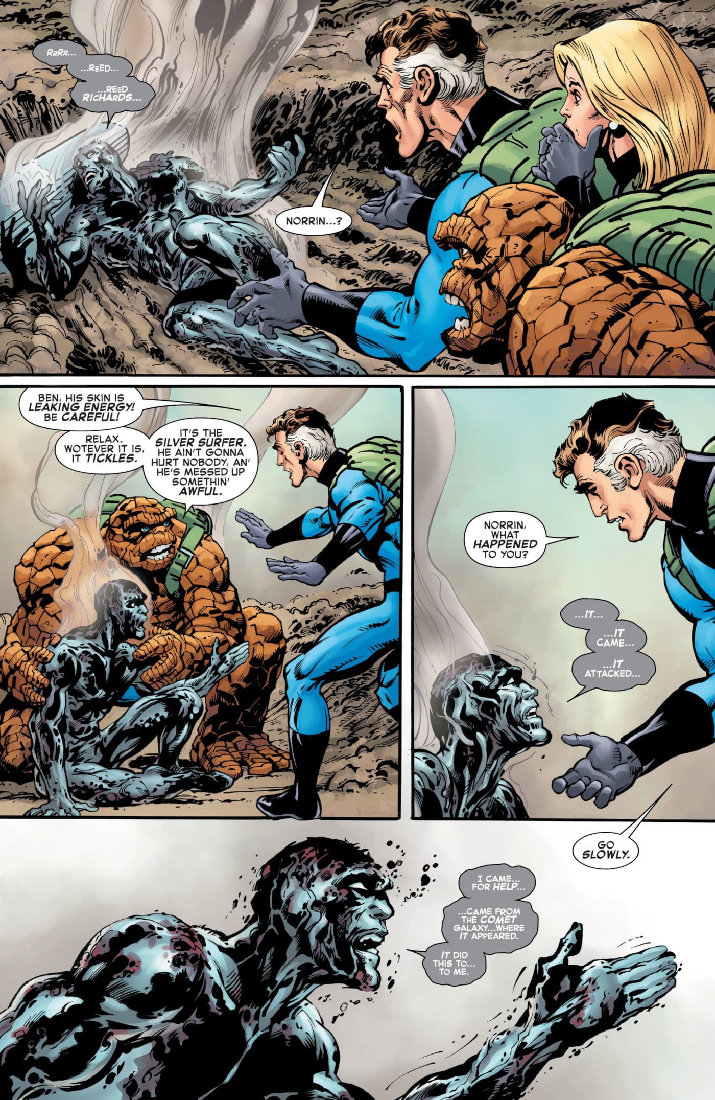 I think pairing him with Mark Farmer on inks was a good choice. Farmer’s long collaborations with Alan Davis brings a similar verve to the line work. A smoothness to the lines that works well for superheroes overall. The bombast is maintained through Laura Martin’s (with Andrew Crossley for the third chapter) colours. Bright and colourful. And there’s some interesting lettering from Joe Caramagna, giving a unique world balloon to Silver Surfer for some reason