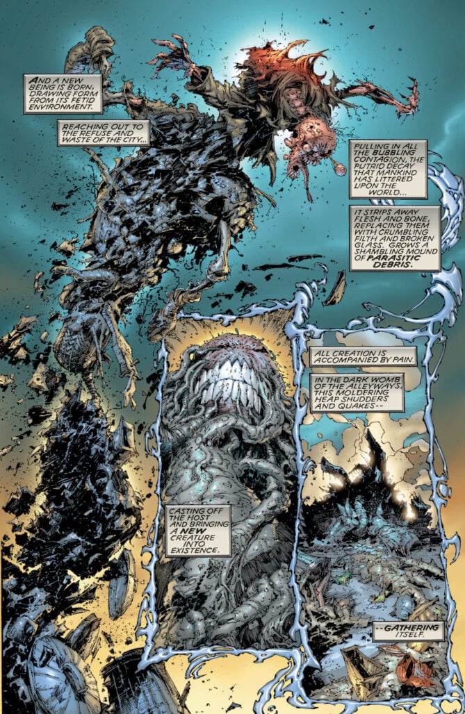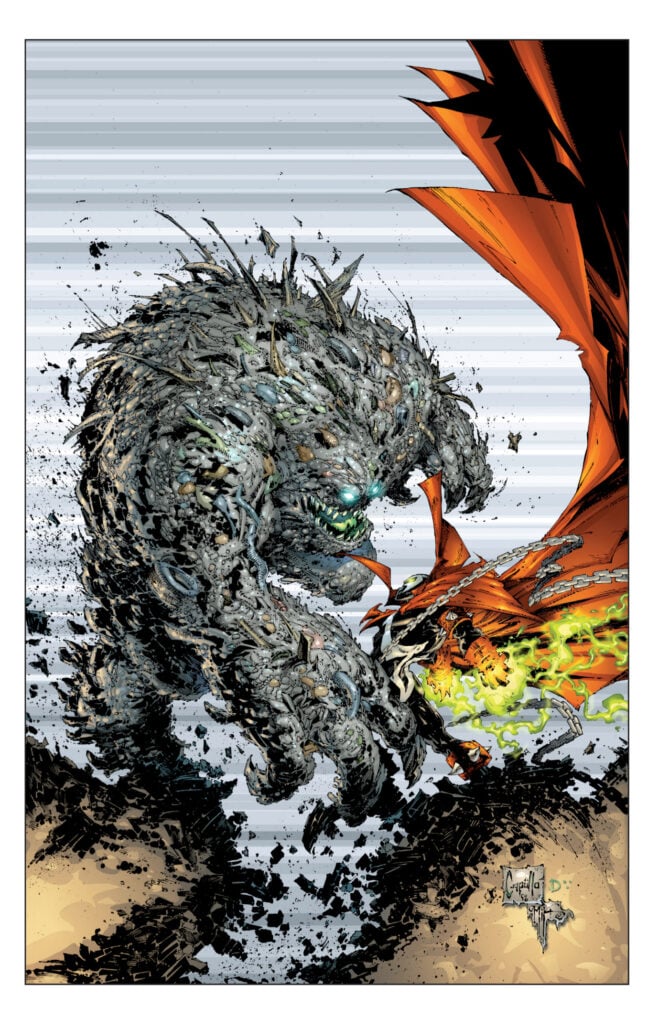 I’ve seen people say that Greg Capullo levelled up when he took on Batman with Scott Snyder. I can see why people would put that forth, with an adventurous, shifting layout, even turning the book around in one issue, but I think it comes down to whether or not you like clean lines. Jonathan Glapion’s inks, I would argue, are part of what makes that look. On Spawn, I’d say the adventurous layouts and impressive character designs were always there, there’s just a busier, frenetic style more in line with McFarlane’s own style (which also makes sense given that he’s one of the primary inkers here) along with Danny Miki and Chance Wolf, both maintaining that style. It fits with the dirty, chaotic atmosphere of the story and helps make the Heap look like a…well, living pile of refuse, debris, and detritus that he is.