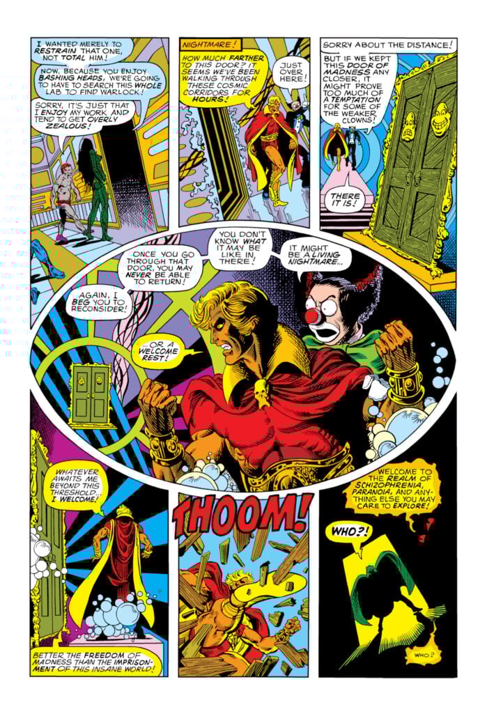 The story is exposition heavy. Not only diving in to all of Warlock’s backstory before his appearances in Strange Tales, but also recapping the previous segments of those issues for the new readers every (other) month. Yet, this is one of the things that I love about Starlin’s storytelling. He works that exposition in to the new segments in interesting ways (like an outright visible narrator) and he takes some captivating approaches to his layouts in doing so. From the presentation of the grids to more unique burst layouts. There’s always a feel of deliberate pacing in how he designs his pages.