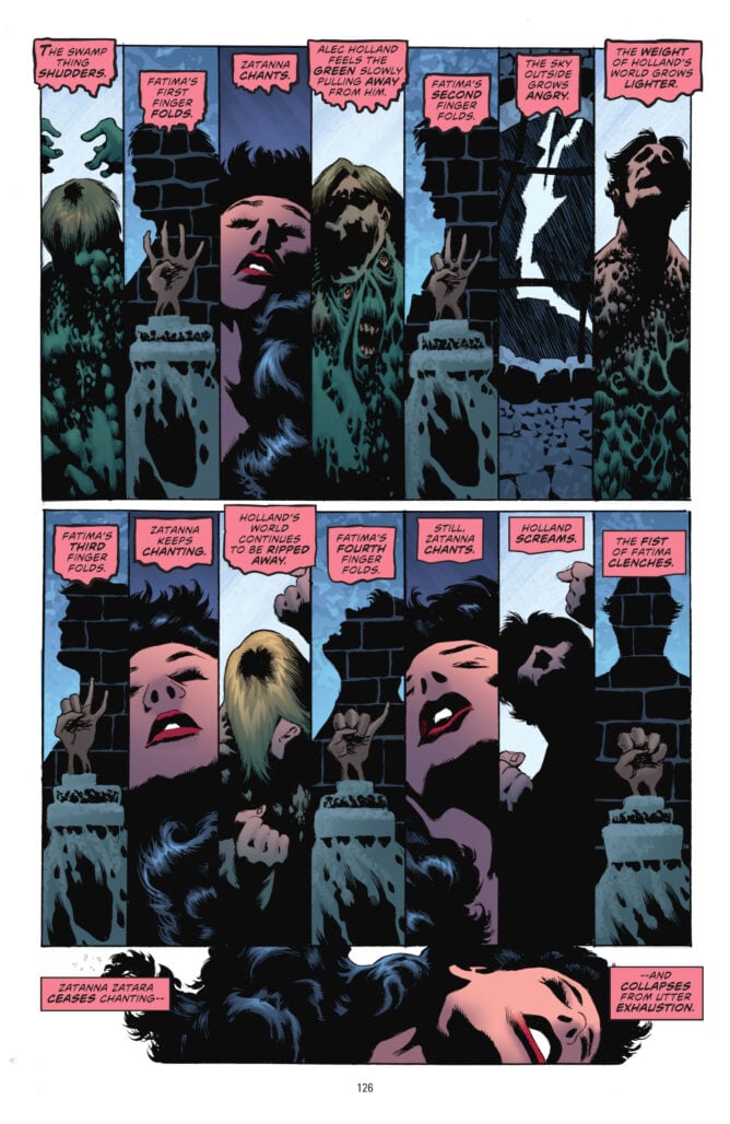 Kelley Jones’ artwork is phenomenal. His latter day work is simplified from his earlier impossibly muscled, detailed work with more solid shadows and simple backgrounds. It works incredibly well for the horror here. You also get some really neat details in how he constructs Swamp Thing’s face and tendrils. The shadows of Jones’ art enhanced through a straightforward, primary colour palette from Michelle Madsen. Also quite like the shift in unique word balloons from Rob Leigh when different characters take on the mantle of Swamp Thing.