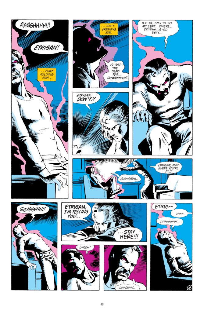 There are some interesting expressionistic sequences of colour from Adrienne Roy and Anthony Tollin as they seem to trade off issues. While there’s a relatively dark approach to the colour palette, it’s offset by the bright primary colours of Etrigan’s only colour pattern. An inverse of what you’d kind of expect, where the ostensibly evil elements are the brightly coloured portions. And John Costanza earns his title as one of comics’ greatest letterers working with the sheer volume of text and the amount of rhyming prose.