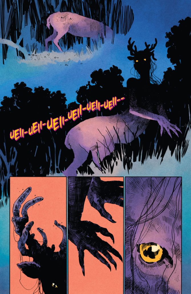 And moody artwork from Dani and Tamra Bonvillain. Dani’s style calls back to DC’s horror and crime artists of old, like Richard Case and Eduardo Risso, with a heavy emphasis on solid black inks, fine scratchy lines, and a spare approach to character shapes. With some haunting designs for the monsters and weirdness going on in the story. Enhanced by a darker colour palette from Bonvillain, some sickly colours for washes, and the occasional weird glow.
