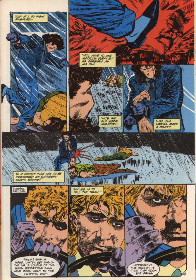 The trouble ends up being that raising philosophical questions is not sound in and of itself. Nowhere is this more clear than in the infamous The Question #15 “Epitaph for a Hero.” This story follows Vic Sage as he investigates a corrupt mayoral candidate with possible ties to white supremacy, and runs into a bigoted private investigator who makes liberal, uncensored use of various racial slurs. The character is painted as completely morally reprehensible, called scum and disassociated from Vic as much as possible…until the very end where he gives his life to save Vic Sage.