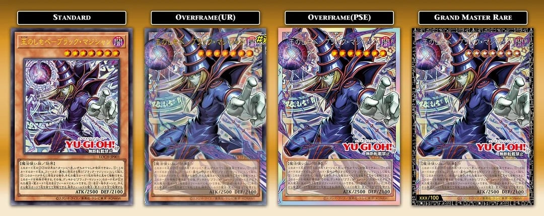 The standard versions of the card feature the classic card template, but what really has collectors interested are the extended art cards, available in Overframe or extended art as Ultra Rares and Prismatic Secret Rares, as well as a new Grand Master Rare printed with a unique serial number. The Grand Master Rare cards can be identified by a rainbow coating applied over the Attribute, Level/Rank, and text box border, a hieroglyph pattern on the card edge, and a serial number from 001 to 100 engraved in place of the card ID.