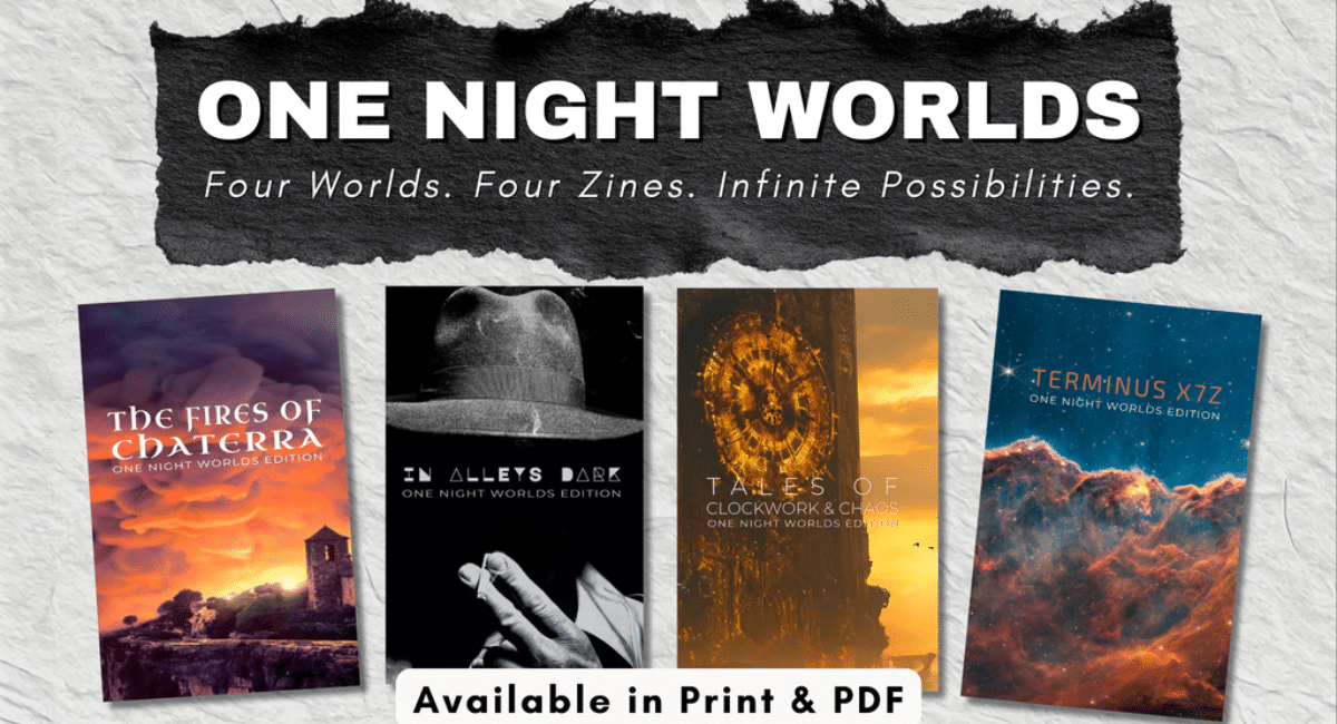 Goodies: Get the Tales of clockwork & Chaos, Terminus X7Z, The Fires of Chaterra, and In Alleys Dark for $12 each. The One Night Worlds Omnibus (Paperback for $28, the ONW Zine Bundle for $35, or at higher tiers get the supporter bundle for $50, and much more!
