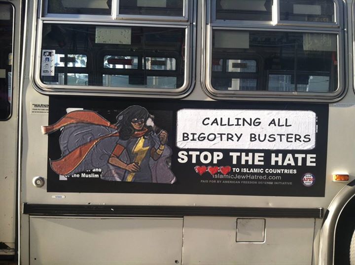 This is especially poetic as Kamala is a Pakistani-American teenager and Muslim superhero, I might add. Her deeds were posted by Street Cred and have spread far and wide, befitting any hero’s work. While many may cry foul that the unknown artist’s actions are oppressing free speech, in actuality, this is a fantastic representation of public discourse in action and a poignant means of engaging such an issue in light of how many of the reactions to the attack on Charlie Hebdo’s office in Paris ended up: scattered, veering, and hasty.