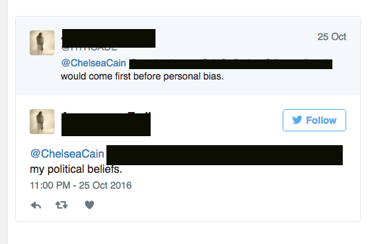 Furthermore, Chelsea Cain can quit twitter over anything she wants to and it’s not up to us to judge her motivations. (According to the Truthers she was just trying to get attention for her now cancelled book.)