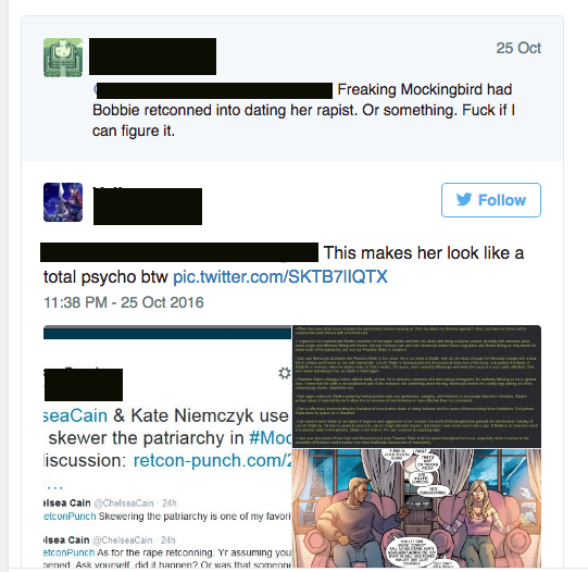 Calling her a “psycho bitch” (which I read initially as definitely directed more towards Mockingbird than Cain herself, though the one guy pressed the issue onto Cain) is the only thing that can even come close to resembling some form of harassment. The idea that Chelsea Cain was endlessly harassed enough to quit Twitter compared to what Leslie James went through this past summer is laughable. Being called names is really shitty, but harassment? Come on. This very website has called many other far worse. Stating “maybe Mockingbird failed because people don’t want to be lectured?” is a valid criticism. You can agree or disagree with it all you want, but it’s valid, and it’s stated in a way that’s not rude to the author in the least. If Chelsea Cain was called, well, whatever the white equivalent to the n-word is, pejoratives about a woman’s vagina, or whether or not she should be raped, then that’s harassment. People complaining about the book’s take on identity politics or whether or not is lecturing is just that: complaining. It is absolutely not harassment, and to call it as such essentially lessens what actual harassment towards women can be and can do to them, and it allows less critical discussion of what comics are or should be. I want to hammer this home: Just because you disagree with someone doesn’t make their opinion harassing or a form of harassment. If they sat there and tried to doxx her or threaten her with shit like rape and other horrific things, like what James suffered, then we’d have a real discussion. This is hand wringing of the highest order.
