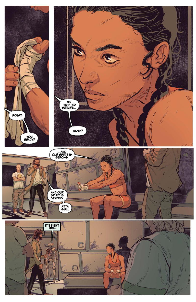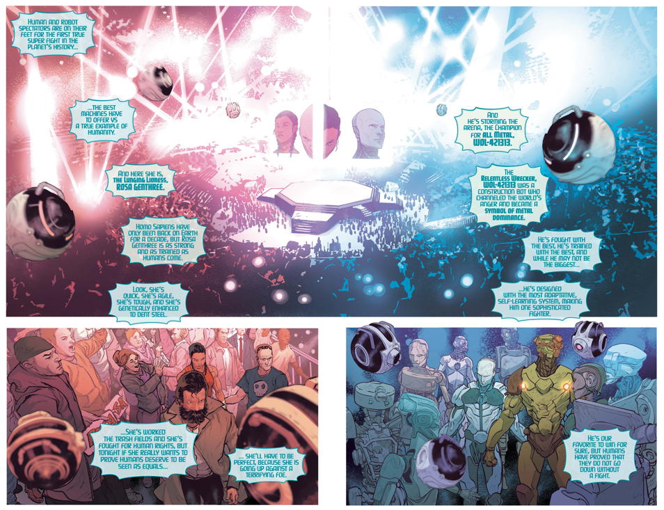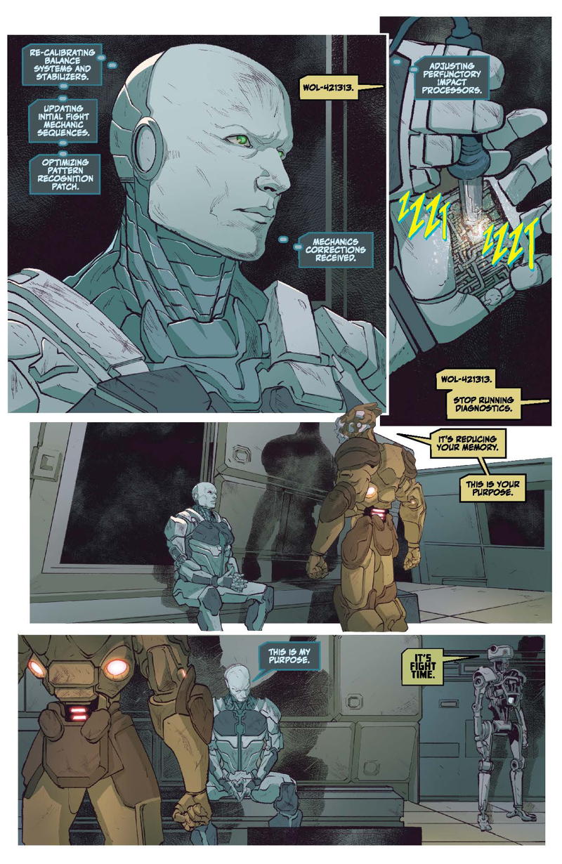 (W) Zack Kaplan (A) Guilherme Balbi, Marco LeskoIn an inverted future, evolved robots have resurrected humans for manual labor. When a tribalistic cultural clash breaks out, a fearless human fighter and a frustrated, displaced robot will square off in a public MMA-style sport fight of epic stakes to determine once and for all who reigns supreme: man or machine.