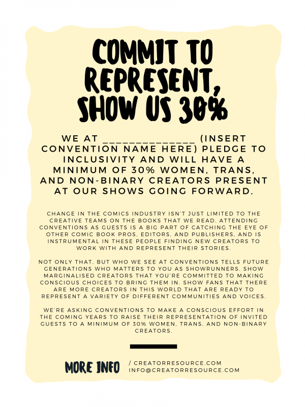 So, not only are folks who are already at an institutional disadvantage expected to do the work of gaining access into unfriendly spaces but then they alone are supposed to bring about change? No. We can do better and we’re not alone in thinking this. On April 24, Stephanie Cooke, the woman behind the comics toolkit website Creator Resource, posted a call to action. The request? To increase representation of marginalized groups at comic conventions to at least 30 percent.
